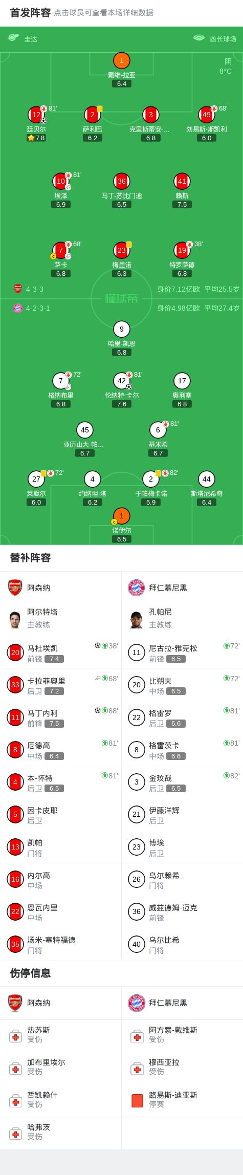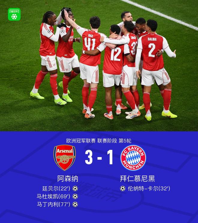 北京时间11月27日欧洲冠军联赛 联赛阶段 第5轮,阿森纳对阵拜仁慕尼黑。阿森纳廷贝尔破门,马杜埃凯破门,马丁内利破门。拜仁慕尼黑伦纳特-卡尔破门。最终比分阿森纳 3-1 拜仁。