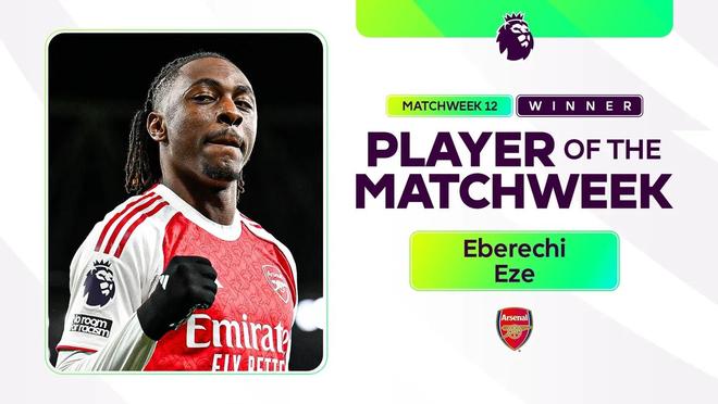 官方消息,阿森纳中场埃泽当选英超联赛第12轮最佳球员。