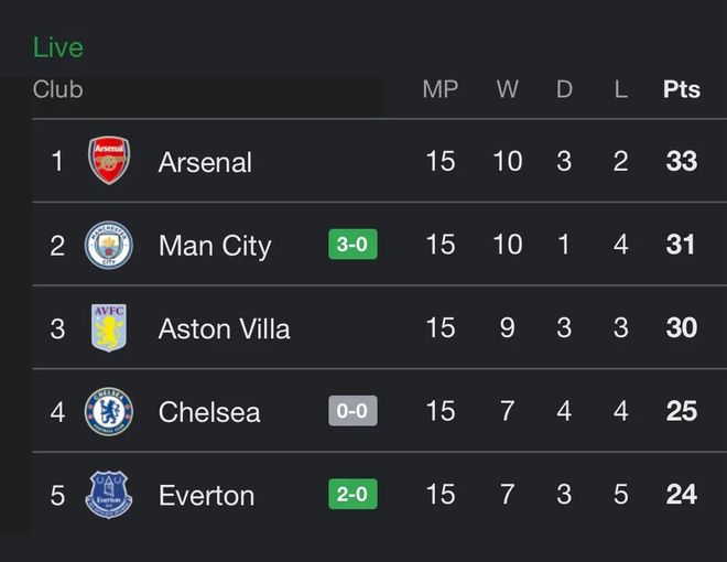 英超15轮过后,联赛的争冠格局发生巨变。在今晚进行的英超比赛中,领头羊阿森纳1-2惨遭维拉绝杀,曼城则3-0轻取桑德兰。在积分榜上,近3轮仅1胜的阿森纳以33分领跑英超。曼城三连胜积31分稳居第2,埃梅里执教的维拉一波五连胜拿到30分排名第3。临近圣诞快车赛程,阿森纳的领先优势仅剩2分,而排名前3的球队仅3分差距,他们也形成了本赛季的英超争冠集团。